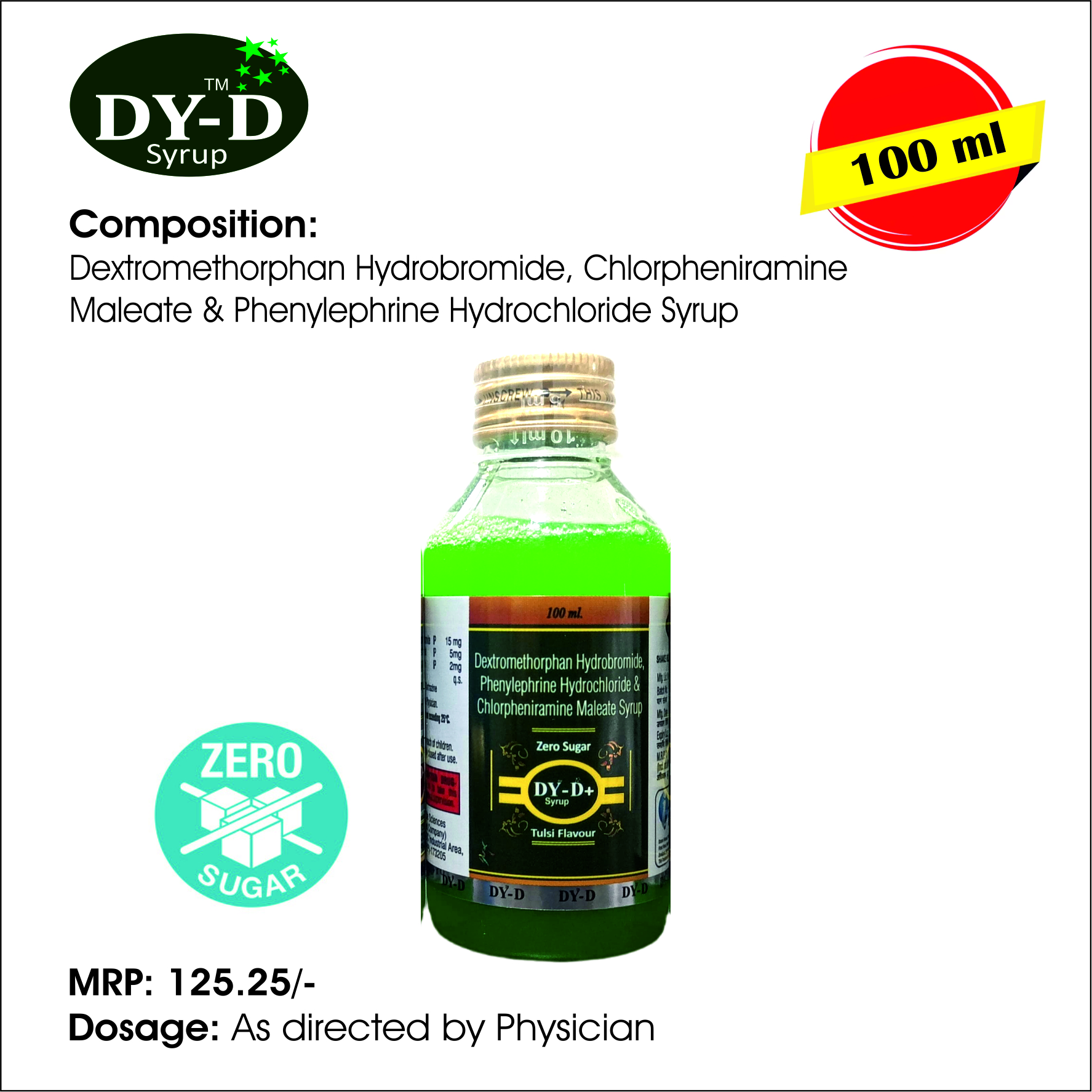 DY-D is a combination medication primarily used to treat symptoms of the common cold, flu, and respiratory allergies, particularly dry cough. Formulated as a sugar-free syrup with a Tulsi flavour, it provides multi-symptom relief from respiratory discomfort.