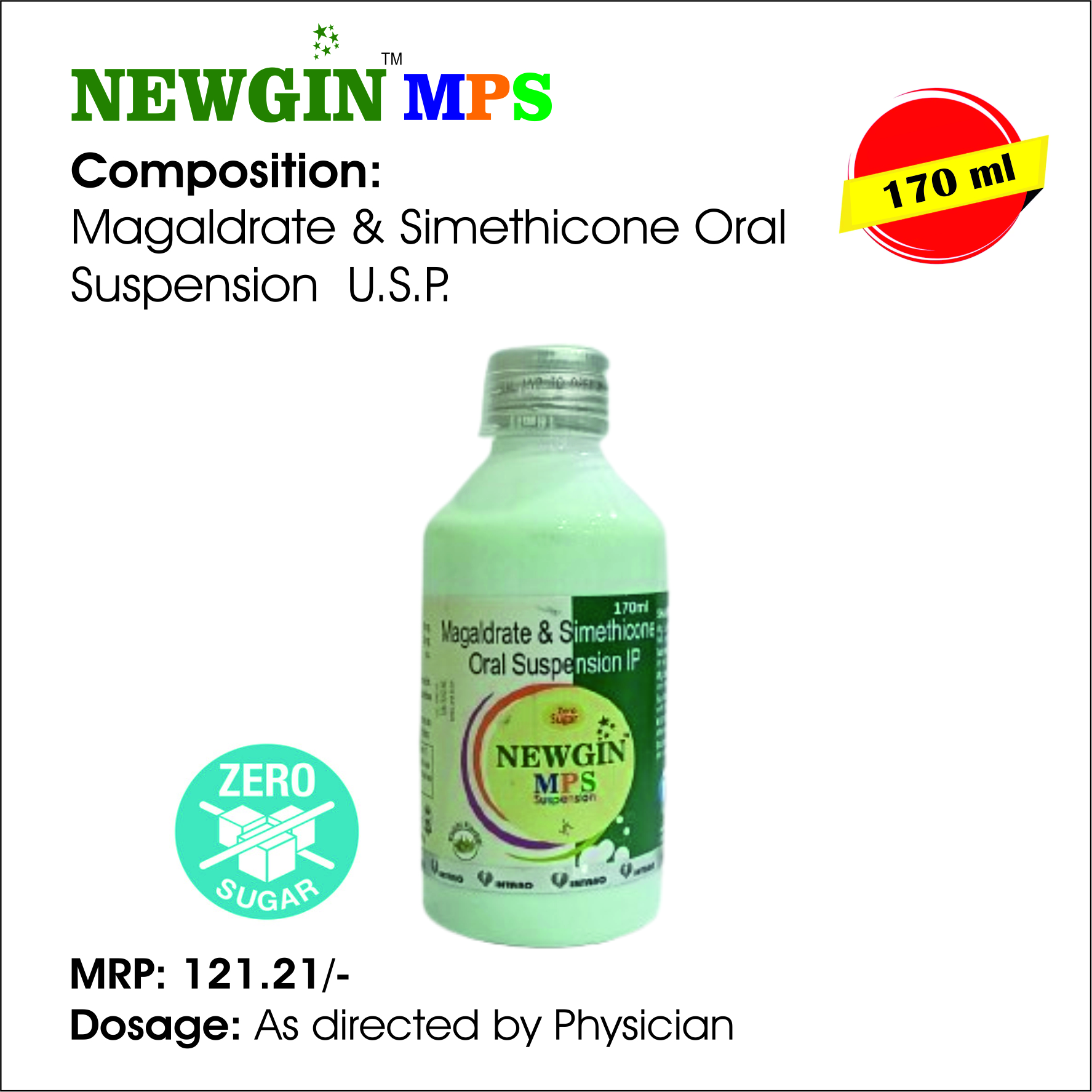 NEWGIN MPS is a combination antacid and anti-flatulent oral suspension primarily used to treat symptoms of excess stomach acid and gas. It is a sugar-free formulation, making it suitable for individuals who need to manage their sugar intake, such as those with diabetes.